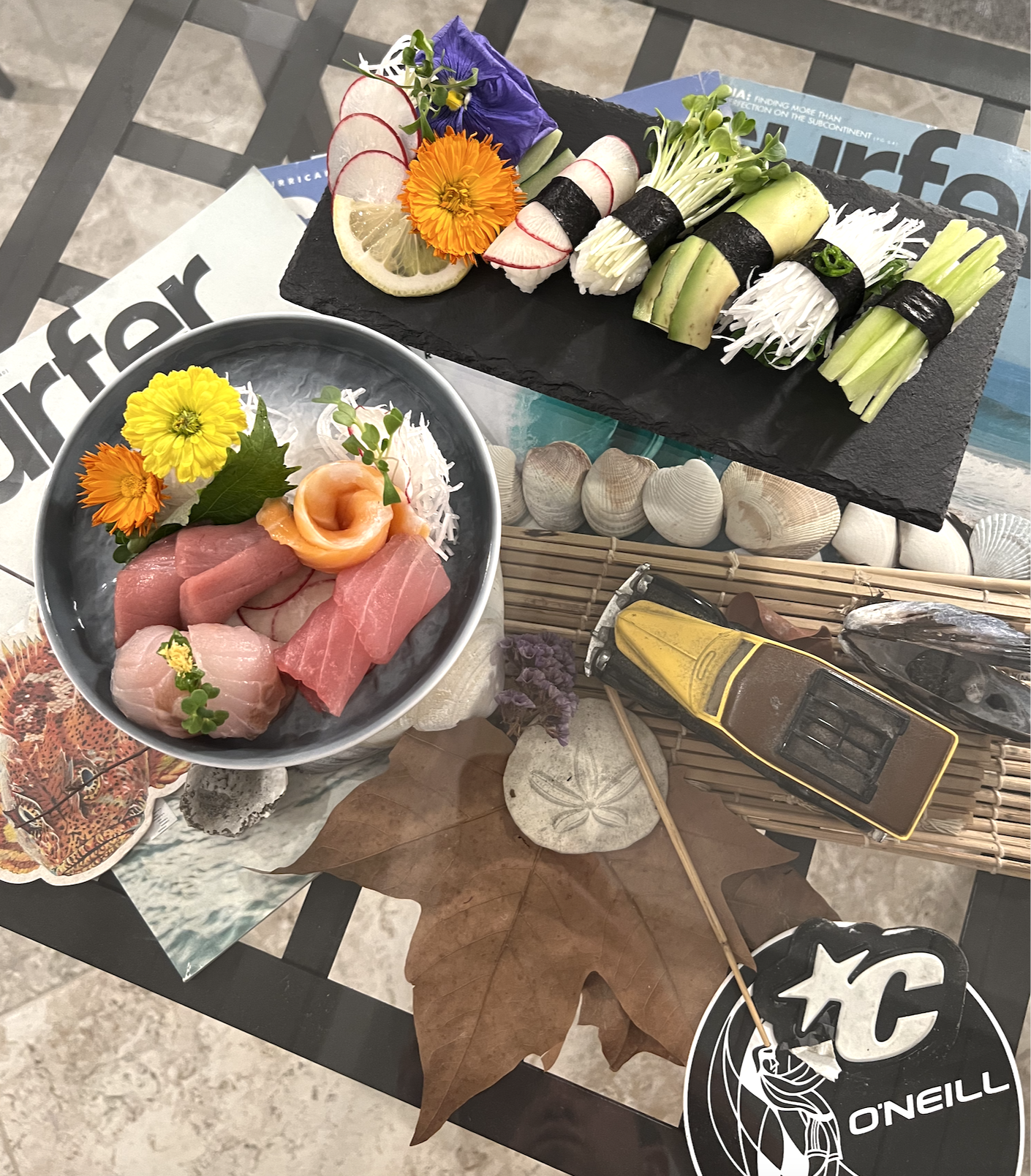 A Surfer's Sushi Chef se centra en ofrecer una experiencia de degustación privada de Omakase (elección del chef) en todo el sur de California. Trabaja principalmente en torno a su propia interpretación del sushi japonés tradicional con un ligero toque de sabores de inspiración francesa y peruana.